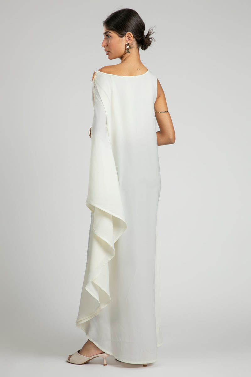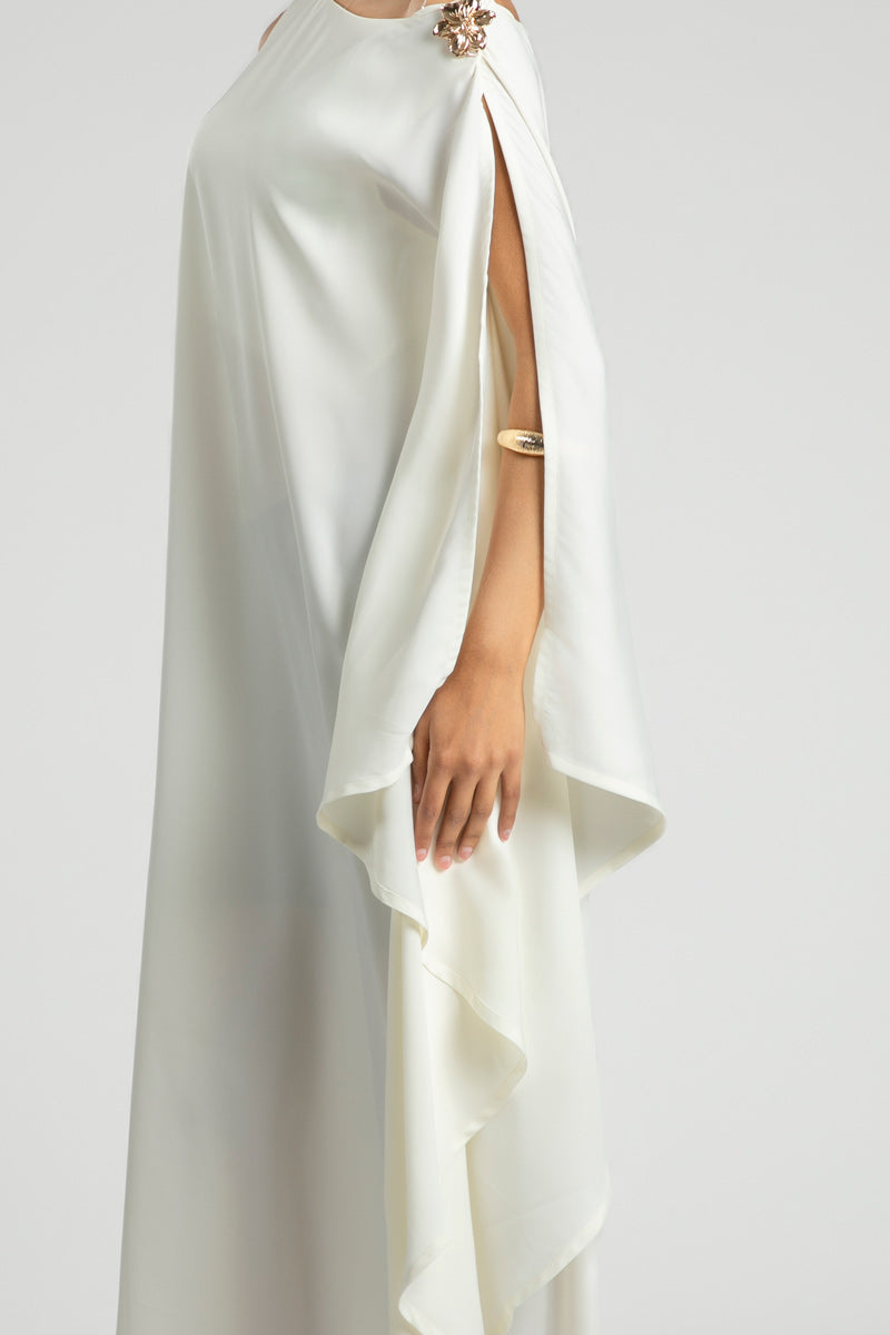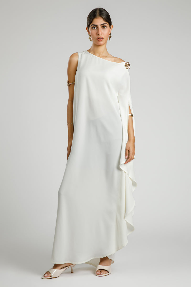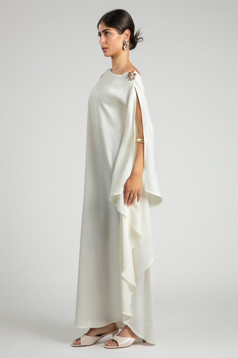 يتميز بقصة مستقيمة ناعمة تنسدل بانسيابية على الجسم، مع تفصيل وشاح جانبي يمنح الإطلالة حركة راقية ولمسة مميزة.