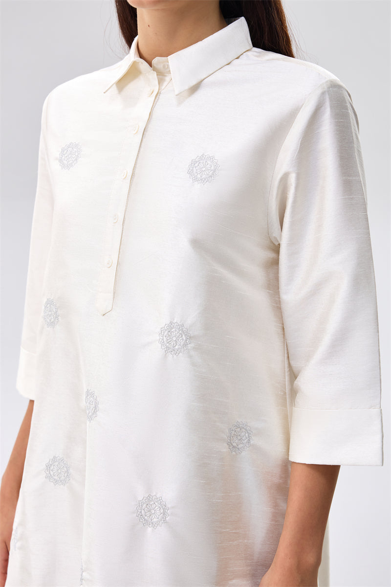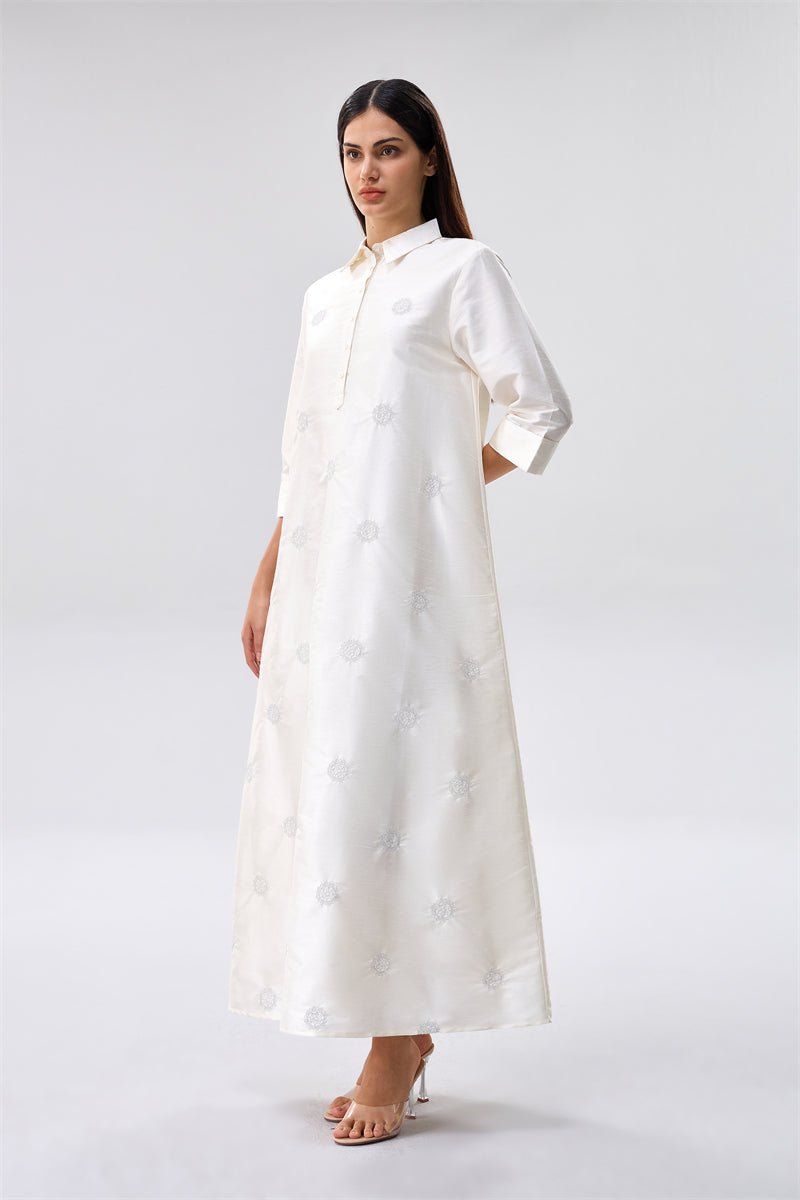يتميز بياقة قميص كلاسيكية مع أزرار أمامية تضيف لمسة مرتبة وعملية، بينما يأتي التطريز الناعم الموزع على التصميم ليمنحه طابعًا هادئًا ومميزًا.