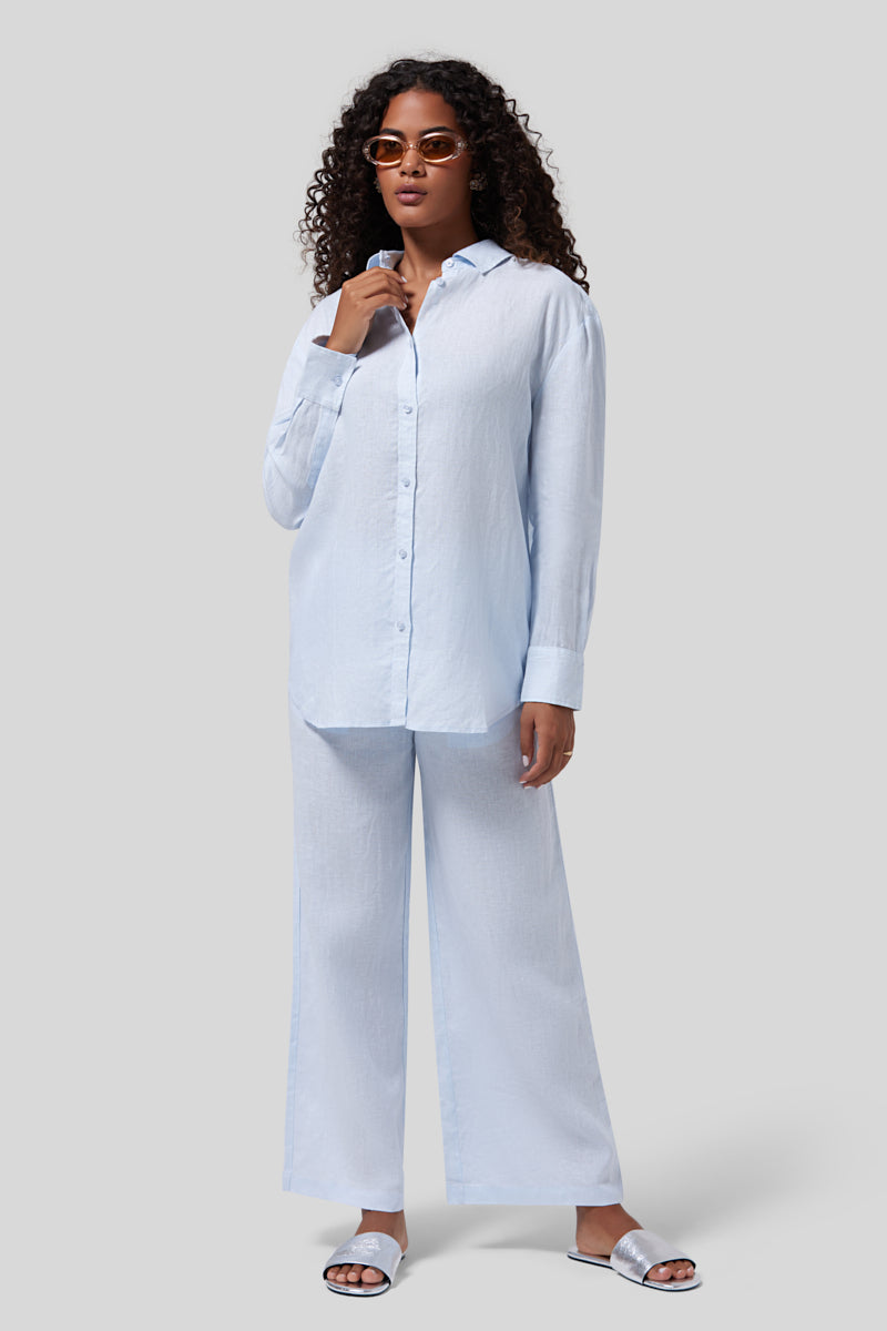 طقم بتصميم أنيق يمنحك راحة وانتعاش، مثالي للسفر وأوقات الاسترخاء. 100% لينن طبيعي يتكون من قميص خفيف ومريح مع بنطال بملمس ناعم وتهوية مثالية.