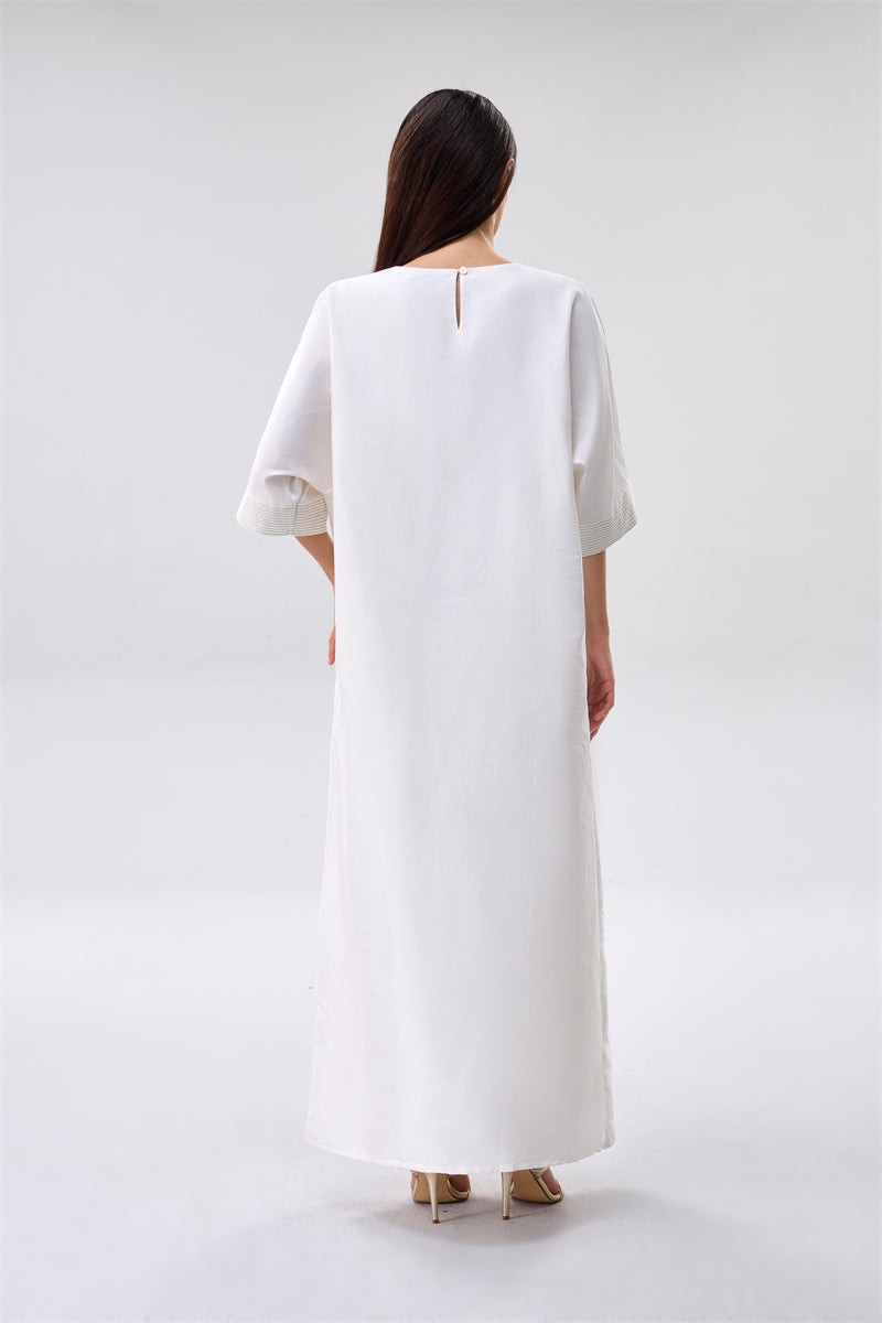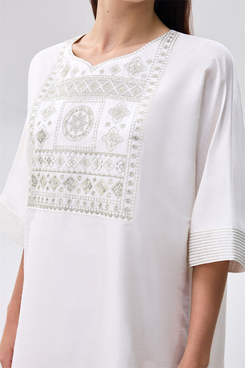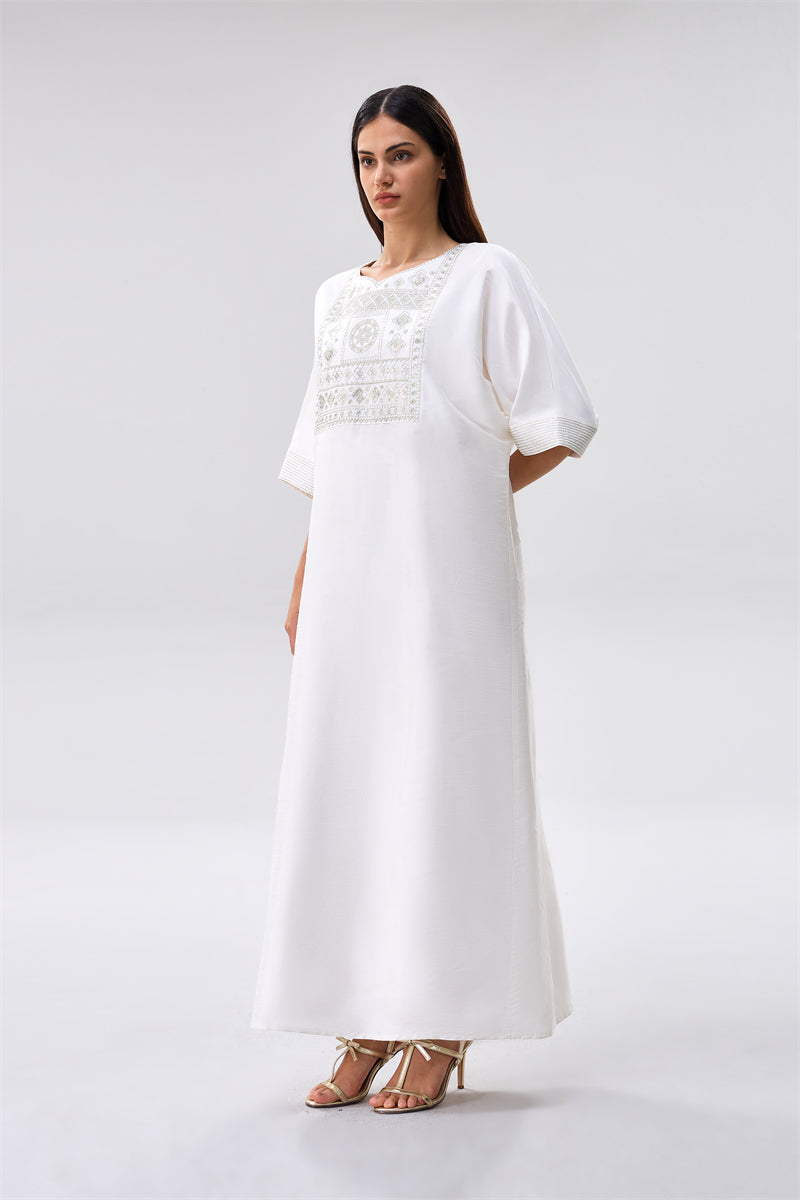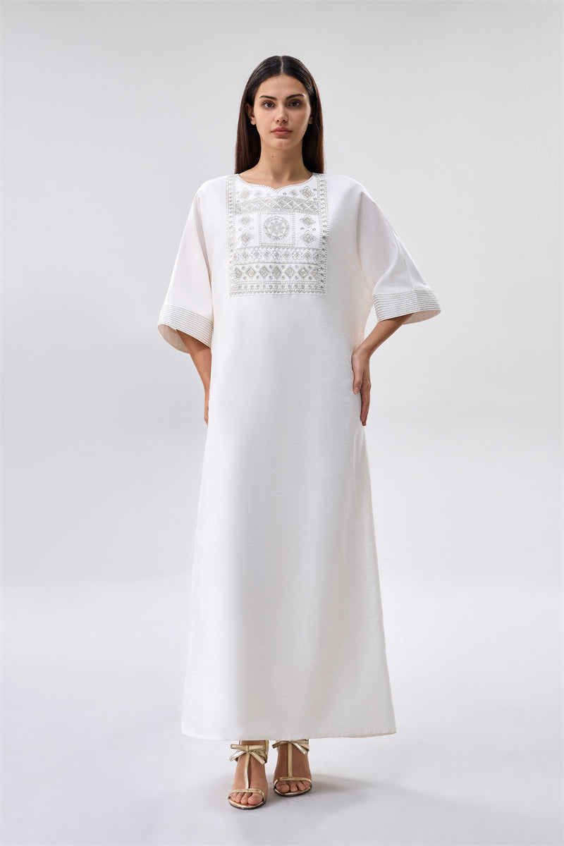 يتميز بتطريز هندسي فاخر على الصدر مستوحى من الزخارف التقليدية، يضيف عمقًا وأناقة للتصميم، مع قصة مستقيمة مريحة تمنحك حضورًا هادئًا ومتوازنًا.